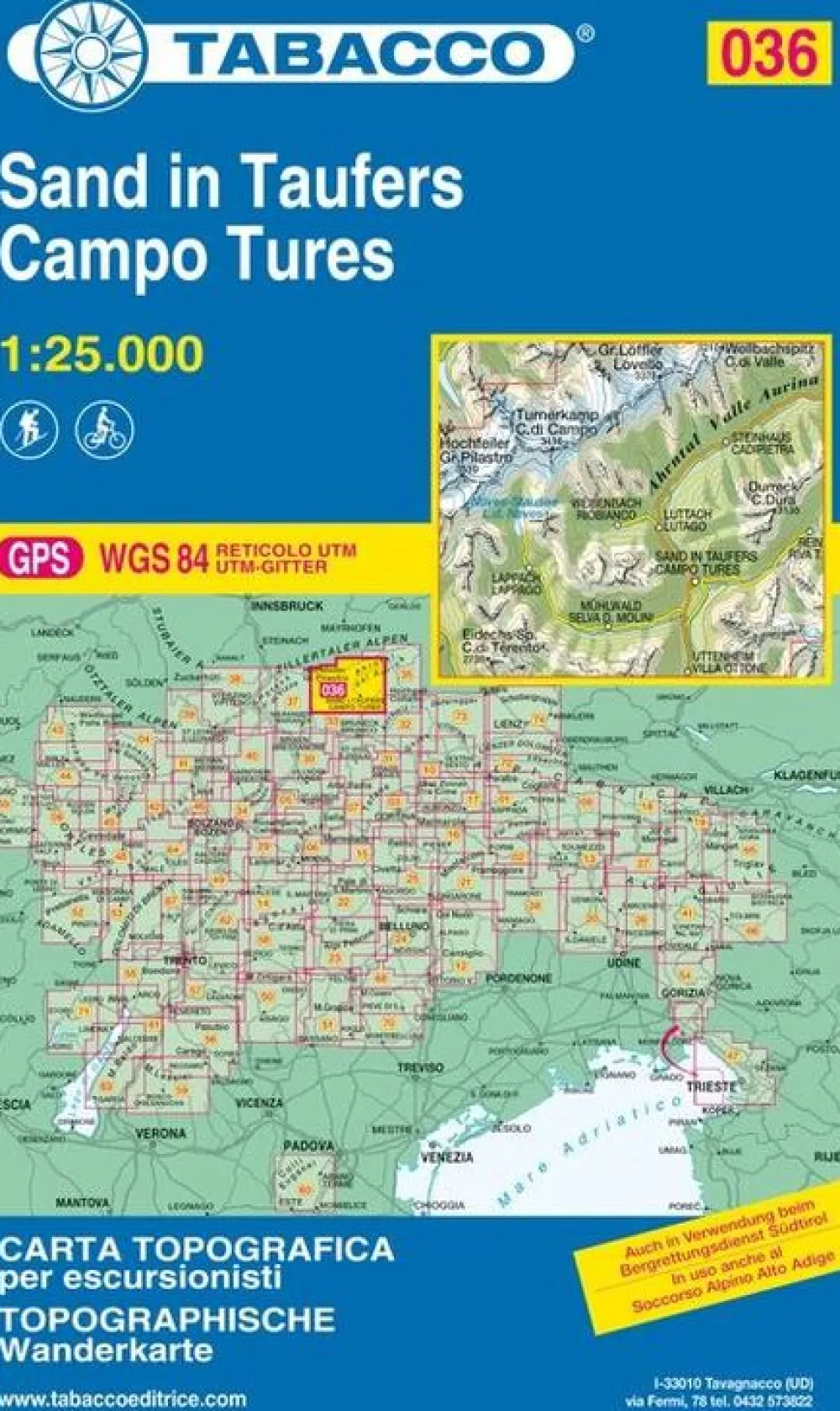 Goede wandelkaarten voor de Dolomieten. Zeer veel topografische details met secure hoogtelijnen (25 meter interval), helder kleurgebruik en bijna alle Tabacco kaarten hebben een UTM grid (voor GPS toepasbaar).