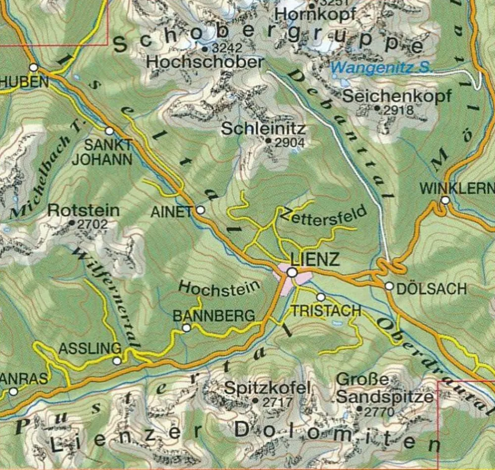 Uitstekende, topografische wandelkaart nummer 074 Lienz – Schobergruppe – Iseltal – Lienzer Dolomiten: met ingetekende paden, waarbij aparte symbolen worden gebruikt voor de klettersteig / Via Ferrata gedeeltes.