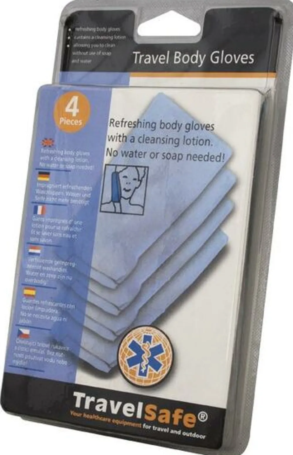 Erg handig voor de persoonlijke hygiëne zijn de TravelSafe “Body gloves”, deze geïmpregneerde wegwerp washandjes maken het gebruik van water, zeep, waskommen, handdoeken en normale washandjes overbodig.