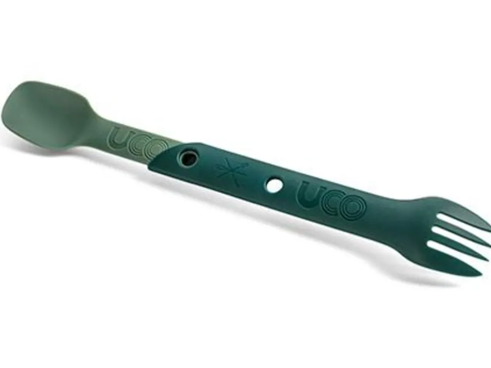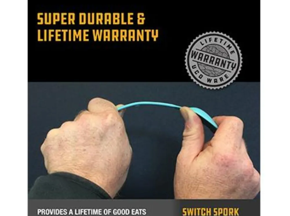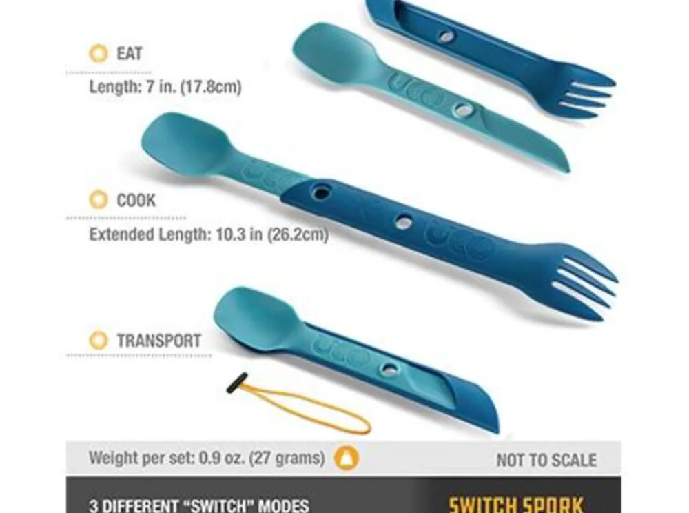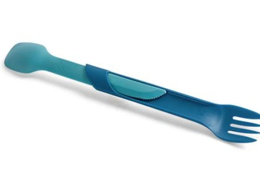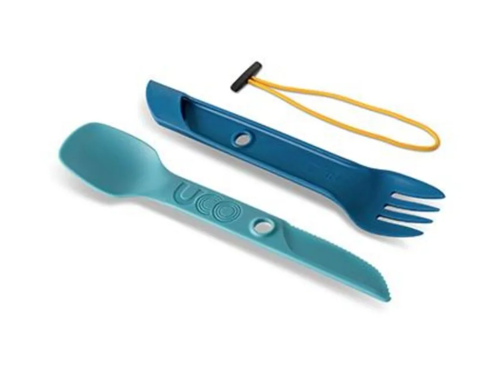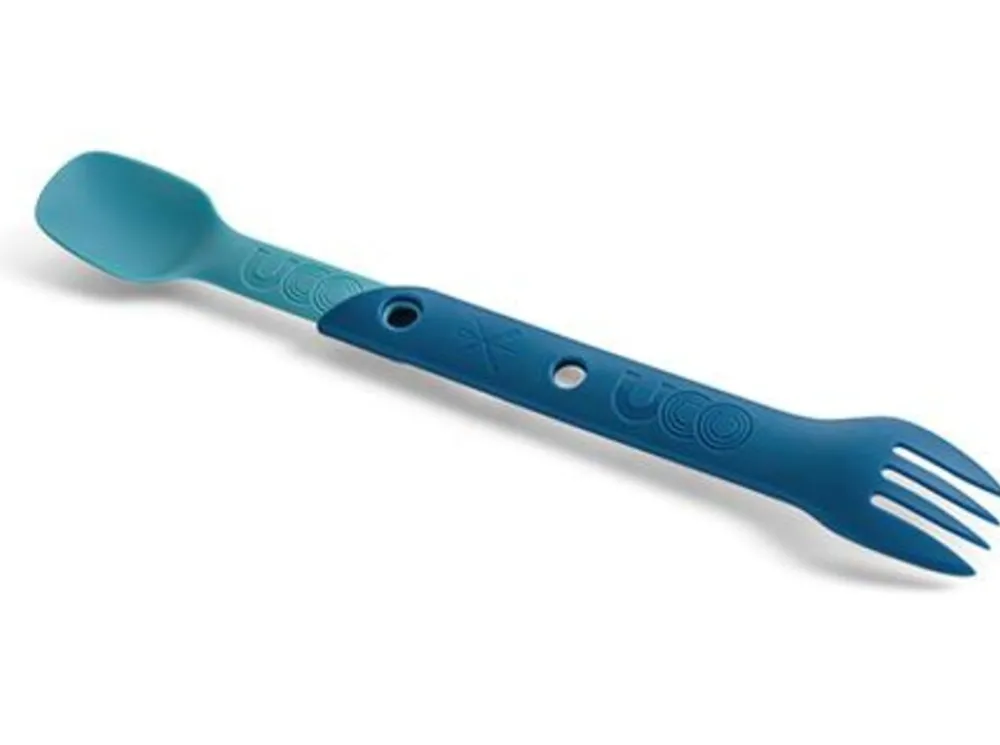 UCO Switch Spork bestekset, een tweedelige 3 in 1 vork, mes, lepel combinatie. Blauw combi. Door de twee delen omgekeerd in elkaar te schuiven ontstaat een extra lange Spork van 26 cm waarmee je gemakkelijk adventurefood uit een zak kan lepelen. Inclusief slim bevestigingssysteem voor aan rugzak. Geschikt voor alle outdoor activiteiten. Gemaakt van zeer sterk glasvezelversterkt nylon, licht in gewicht. materiaal is hygiënisch en gemakkelijk schoon te maken.