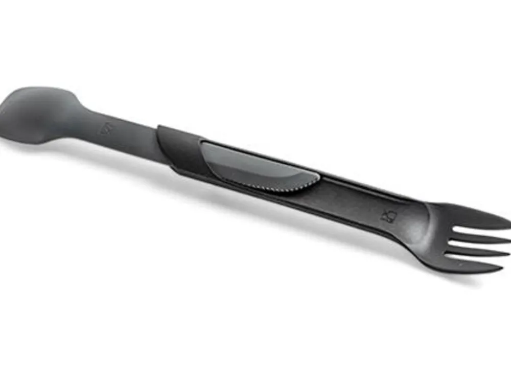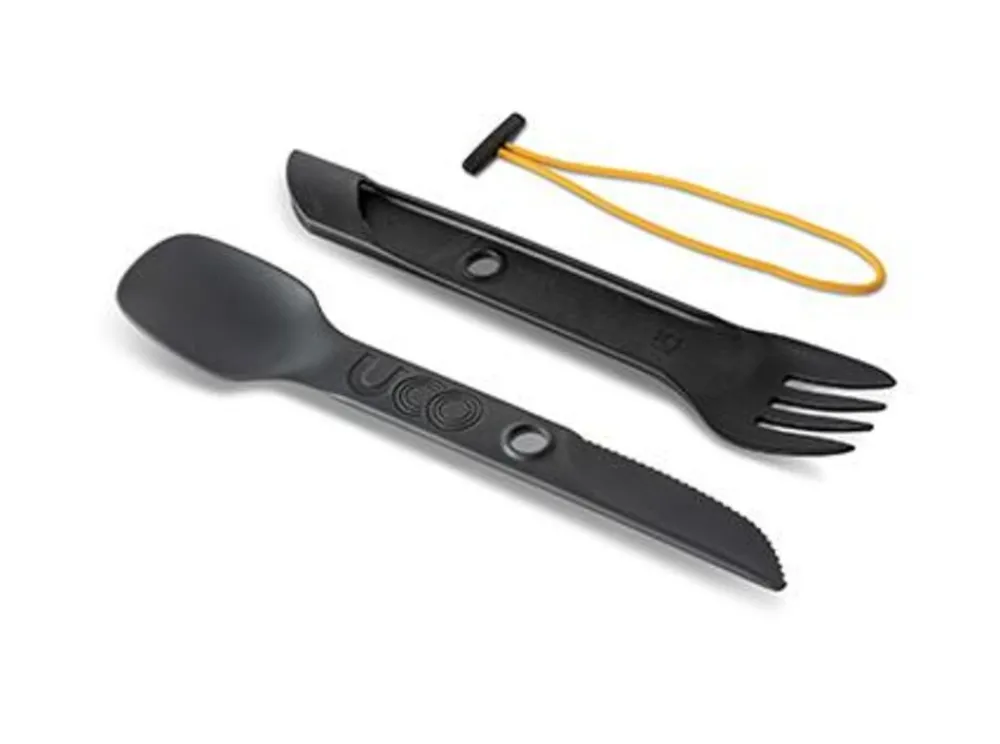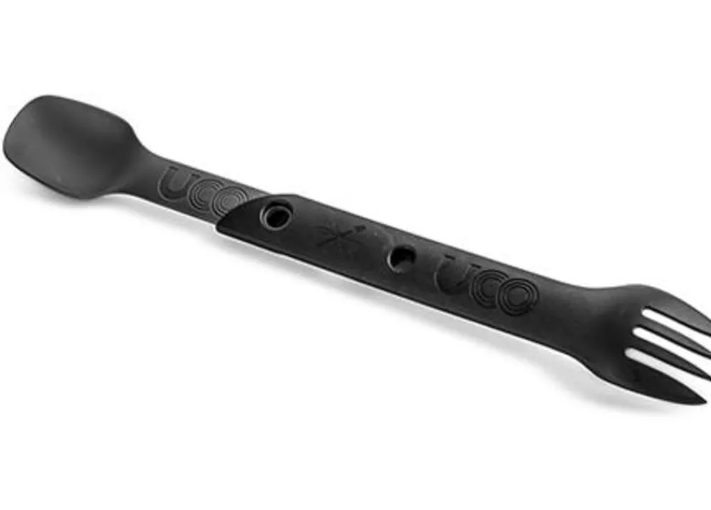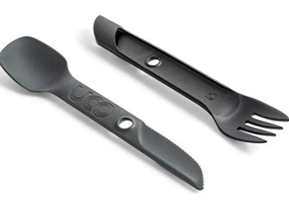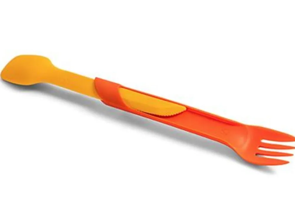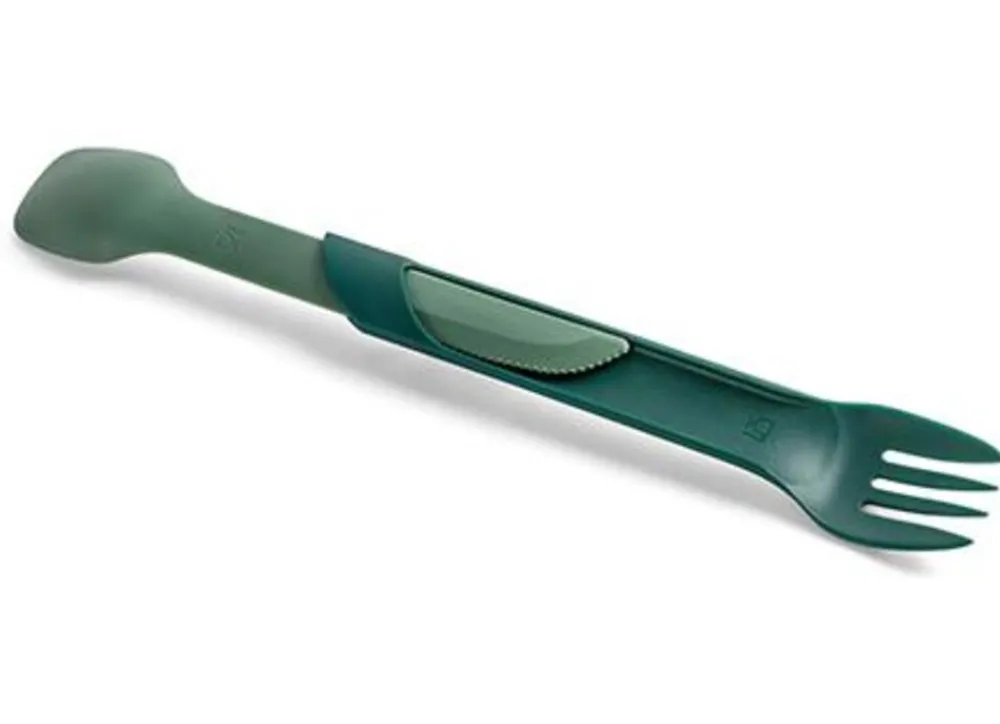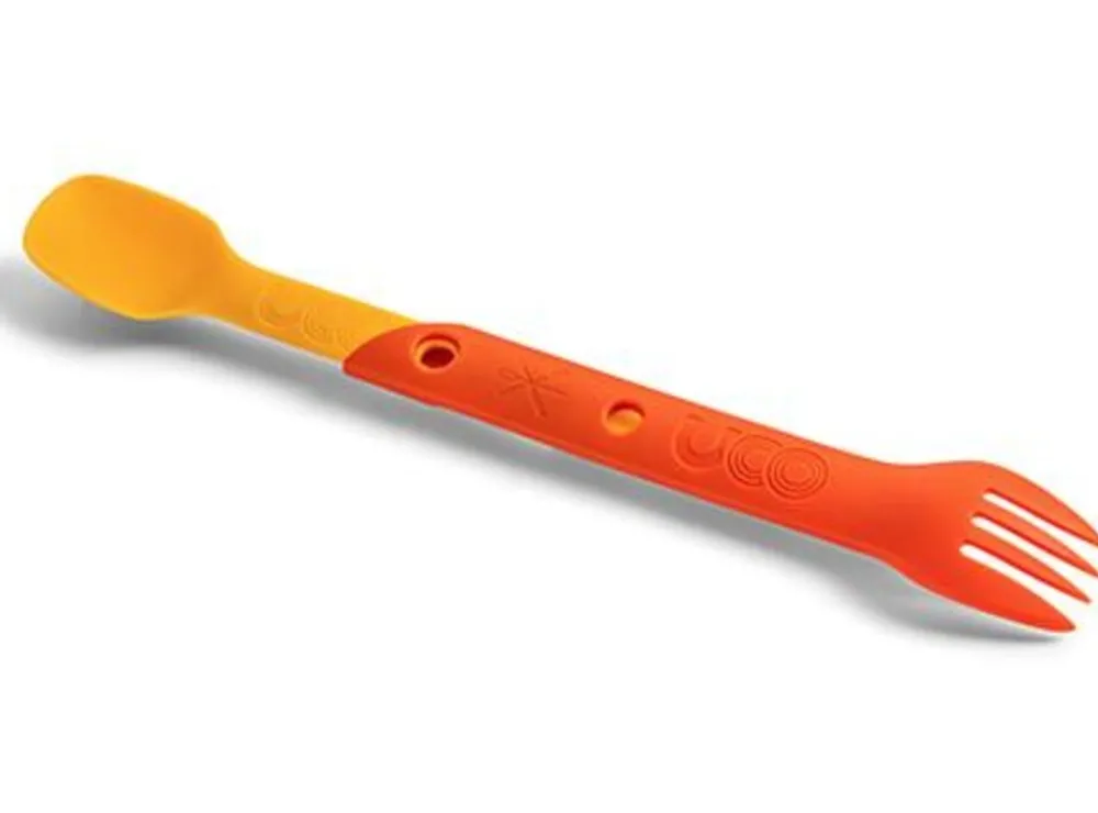UCO Switch Spork bestekset, een tweedelige 3 in 1 vork, mes, lepel combinatie. Blauw combi. Door de twee delen omgekeerd in elkaar te schuiven ontstaat een extra lange Spork van 26 cm waarmee je gemakkelijk adventurefood uit een zak kan lepelen. Inclusief slim bevestigingssysteem voor aan rugzak. Geschikt voor alle outdoor activiteiten. Gemaakt van zeer sterk glasvezelversterkt nylon, licht in gewicht. materiaal is hygiënisch en gemakkelijk schoon te maken.