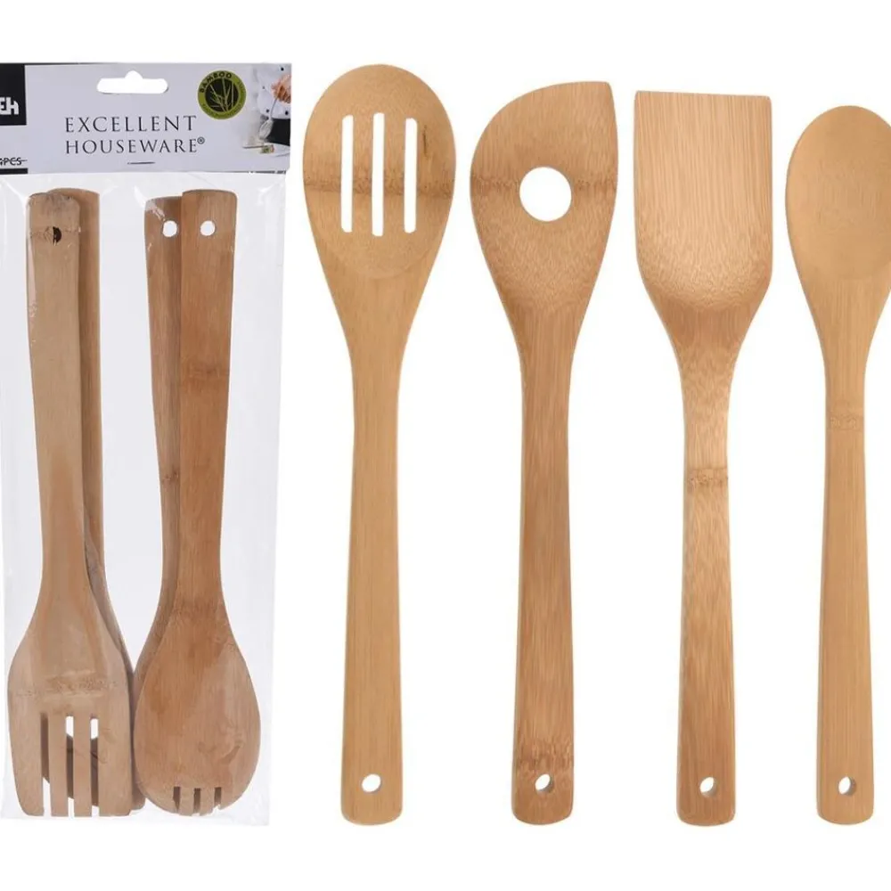Een handige 4-delige kookgerei set gemaakt van duurzaam bamboe. Deze set is geschikt voor reiniging in de vaatwasser en ideaal voor gebruik op de camping.