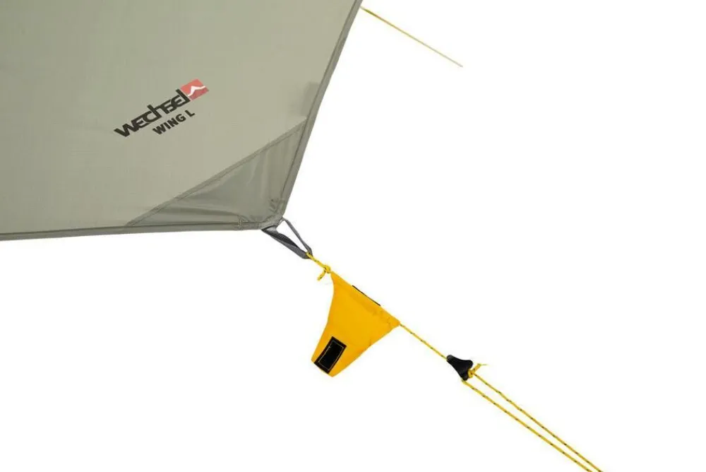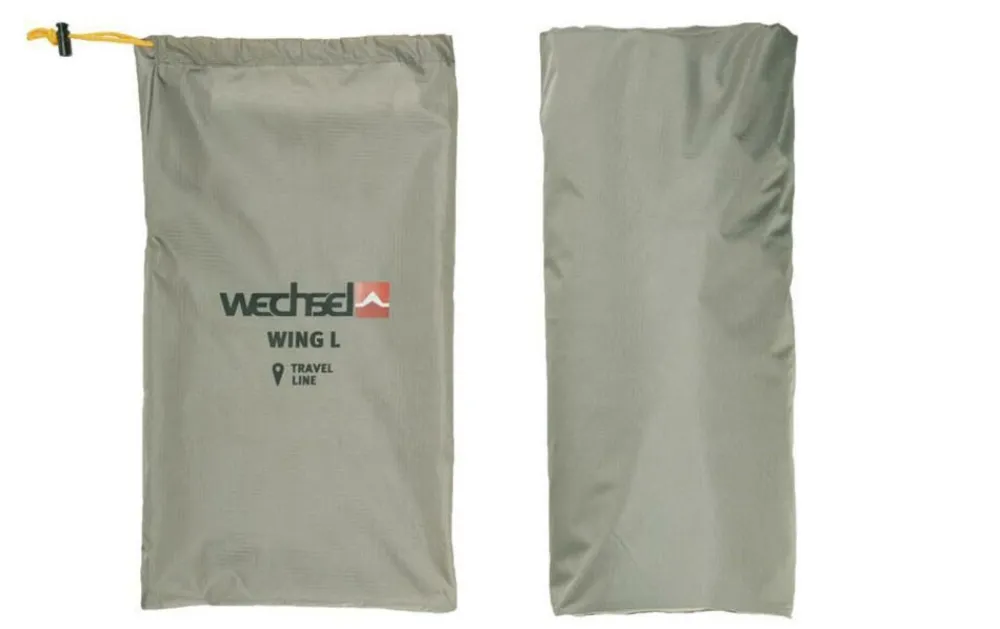 De Wing L Travel line van Wechsel is een universele overkapping met een bovenleidingsnede. Het kan worden gecombineerd met de meeste tenten om een ingang te creëren die beschermd is tegen de elementen. De Wing kan ook op zichzelf worden opgezet als ultralichte bescherming tegen weersinvloeden. Versterkte spanlussen en koorden met spansloten maken de wing zeer stabiel. De Wing L heeft de afmeting van 385 x 410 x 280 cm en een pakmaat van 36 x 14 cm. Stokken en haringen zijn niet inbegrepen.